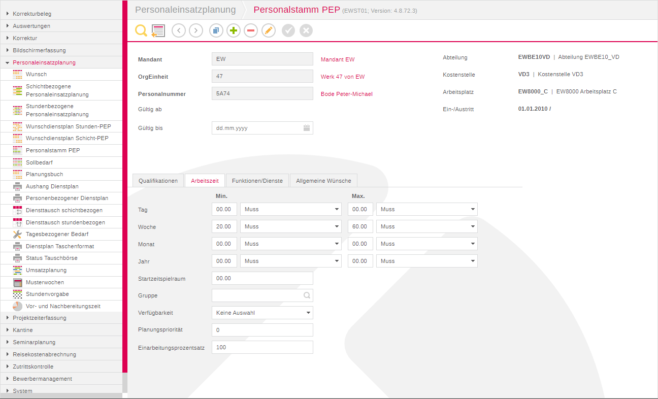 In dieser Registerkarte legen Sie die minimalen und maximalen Arbeitszeiten des Mitarbeiters fest. Darüber hinaus können Sie ihm hier eine PEP Gruppe zuordnen und Angaben zur Verfügbarkeit machen.